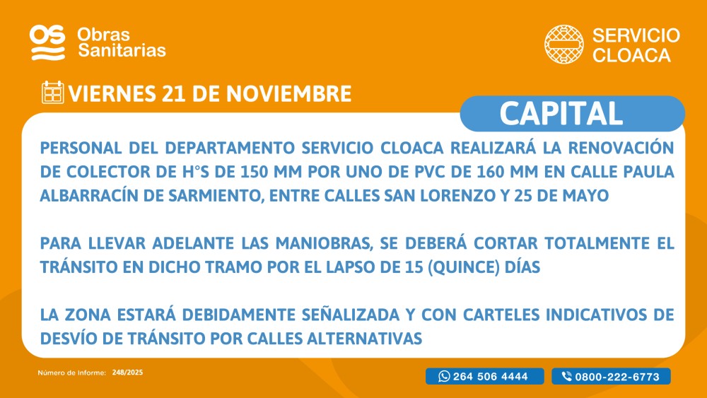 Obras Sanitarias informa que personal del Departamento Servicio de Cloaca de Obras Sanitarias realizará la renovación de cañería colectora de HS 150 mm por uno de PVC de 160 mm. Para llevar adelante estas maniobras, se deberá cortar totalmente el tránsito vehicular en calle Paula Albarracín de Sarmiento, entre calles San Lorenzo y 25 de Mayo, por el lapso de días, a partir de este viernes 21 de noviembre.