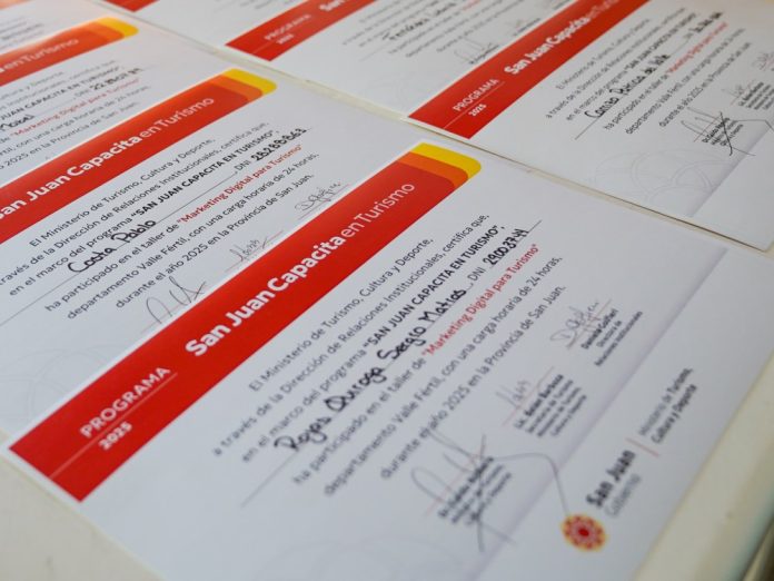 Los cursos se enmarcan en el programa San Juan capacita en turismo y apuntan a brindar herramientas al sector turístico. Al culminar, los asistentes recibieron sus certificados.Con la finalidad de fortalecer la concientización y así profundizar la cultura turística, el Programa “San Juan capacita en turismo” cerró el año con la entrega de certificados a prestadores de Valle Fértil y Sarmiento que realizaron distintas formaciones.En esta oportunidad,Turismo Sustentable; Marketing Digital e Inglés para Turismo fueron los cursos que se brindaron en ambos departamentos durante tres meses.