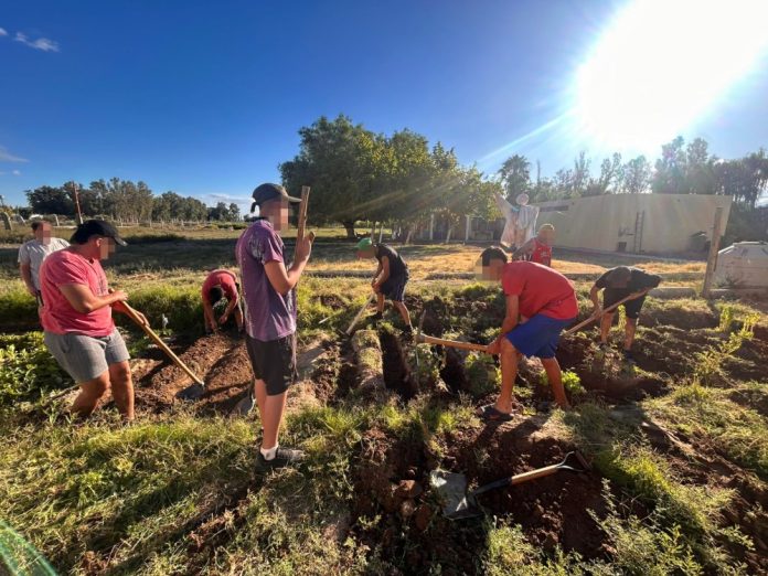 Un grupo de varones que convive en este espacio, trabajan en la huerta para obtener productos y para acompañar diferentes aspectos del proceso de rehabilitación.